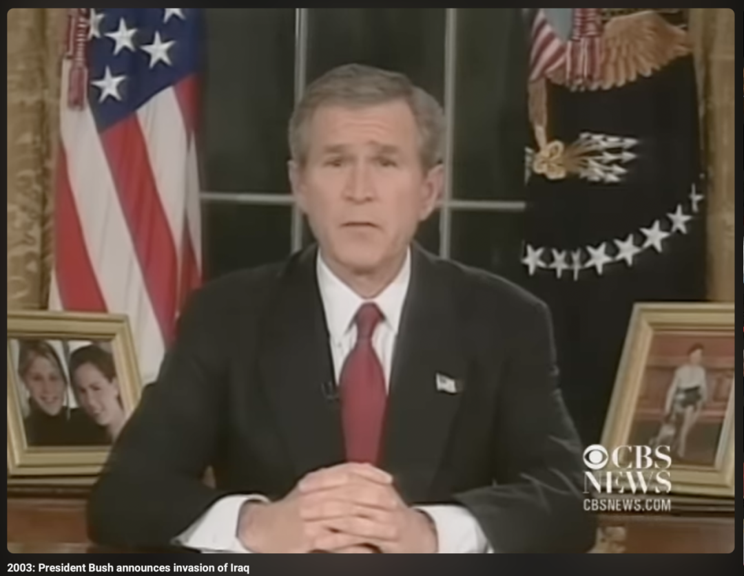 2003年3月19日,美国时任总统乔治·W·布什发表讲话,宣布对伊拉克展开军事行动,理由是解除其大规模杀伤性武器威胁、推翻萨达姆政权并解放伊拉克人民(图源:CBS NEWS)